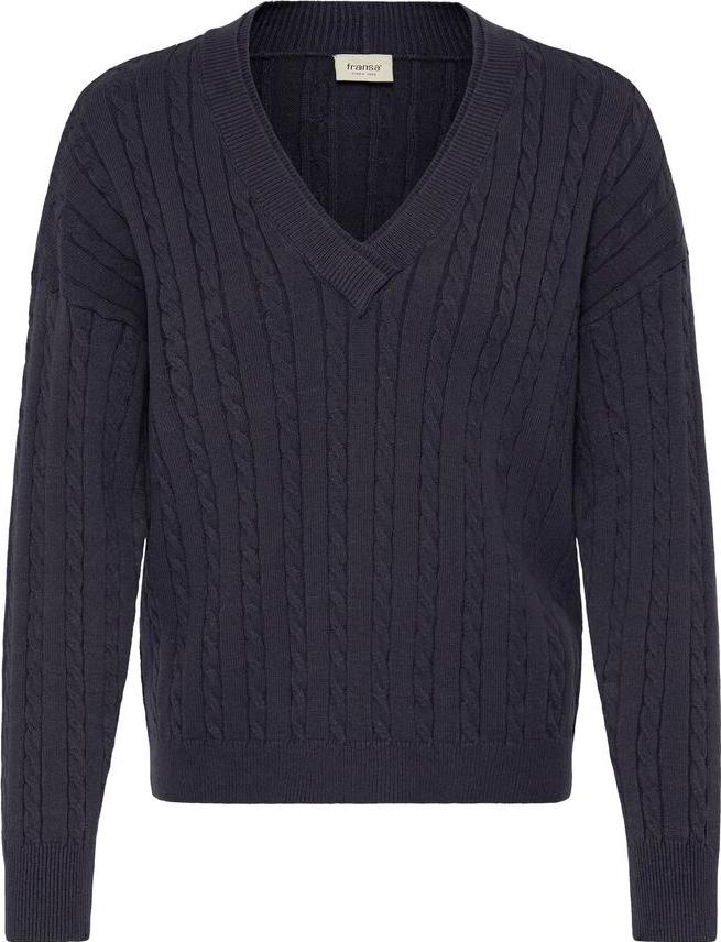 Pullover med v-hals fra Fransa. Flettet mønster, lange ermer og hofte lengde. Composition: 50% Viscose,28% Polyester,22% Nylon Fit: Regular fit, hip lenght, lon sleeve