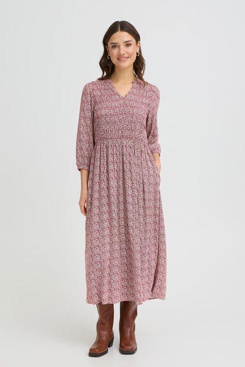 Ny kjole fra Fransa, i 100% viskose. Kjolen har smock detaljer og lekkert blomster print. Material: 100% Viscose Fit: Regular fit, Mid calf, 3/4 sleeve