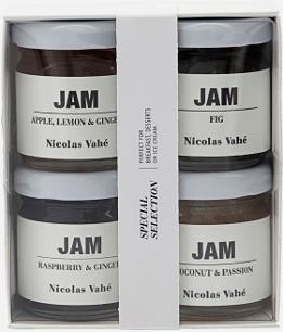 Gaveeske med fire små syltetøyglass fra Nicolas Vahé. Syltetøyet er perfekt som en søt gave til en vert eller vertinne, en kjæreste eller en nabo. Denne gaven består av fire smaker som alle er laget av høykvalitets-ingredienser uten konserveringsmidler eller tilsetningsstoffer, bringebær & ingefær, kokosnøtt og pasjonsfrukt, eple, sitron og ingefær og fiken. Hvert glass inneholder 40 g