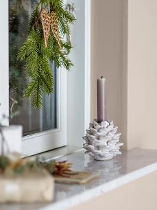 Pine Lysestagen fra Bloomingville er fremstillet i stentøj og formet som en kogle. Den er glaseret med en glansfuld perlemorsglasur, der smukt fremhæver de fine detaljer. Placer denne lysestage på en hylde, eller i vindueskarmen, for at tilføre et elegant og hyggeligt præg til din indretning. D10,5xH10 cm