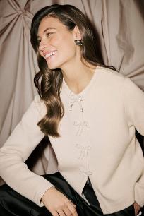 Cardigan med perlesløyfer fra Culture. Lange ermer, vanlig lengde og avslappet passform. Trykkknapper. Composition: 52% Viscose (LENZING™ ECOVERO™),28% Polyester,20% Polyamide Fit: Relaxed fit, Regular length, Long sleeve