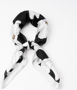 Et klassisk og elegant lite skjerf i sort og hvitt med et stilisert blomstertrykk. Måler 70 x 70 cm og er laget av 100% polyester. Bruk det til halsen, som hårbånd eller vesketilbehør.