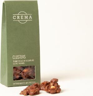 Clusters – Peanøtter med melkesjokolade og salt karamell. Ingredienser: Melkesjokolade (sukker, helmelkspulver, kakaosmør, kakaomasse, emulgator (soyalecitin), naturlig vaniljearoma). Peanøttblanding (sukker, peanøtter (30 %), glukosesirup, hydrogenerert palmekjerneolje, skummet melkepulver, maltodextrin, smør, havsalt, emulgator (E 471)). Kan inneholde spor av gluten. Kakaotørrstoff min. 28 % i melkesjokolade. Melkesørrstoff min. 19,5 % melkesjokolade.