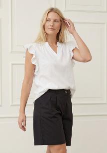 Pearl Flounce Top er inkarnasjonen av sommeren. Den typen topp du tar på en varm morgen - og med en gang føler deg lett, velkledd og helt komfortabel. Passformen er løs og rett, slik at den får lov til å henge fritt rundt kroppen. Den er ikke stram - den faller. Og det er det som gir det avslappede, ubesværede utseendet som gjør den så enkel å bruke igjen og igjen. Rysjedetaljene på ermene er diskrete, men utgjør en forskjell. De hever den enkle designen og tilfører et feminint preg uten å være for mye. Kvaliteten er en myk linsk blanding, der viskosen gir en vakrere drapering og en mer behagelig følelse mot huden - mens linens naturlige struktur skaper liv i overflaten. Stoffet er lett og pustende med en mild gjennomsiktighet, noe som gjør den perfekt for varme dager. Og ja - den krøller naturlig. Akkurat som lin skal. Det er en del av sjarmen. De små foldene og den livlige strukturen er akkurat det som gir den avslappede, eksklusive sommeruttrykket. Med riktig behandling blir den bare vakrere med tiden. Det er en topp du finner frem år etter år. Stylingtips Bruk den til jeans, en lett skjørt eller løse sommerbukser. Den fungerer både til hverdags, ferien og de dagene hvor alt skal føles litt lettere. Materiale og kvalitet: 30% lin 70% viskose