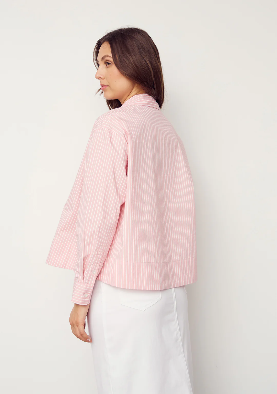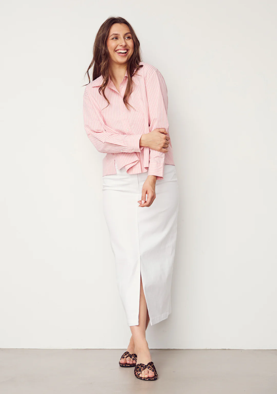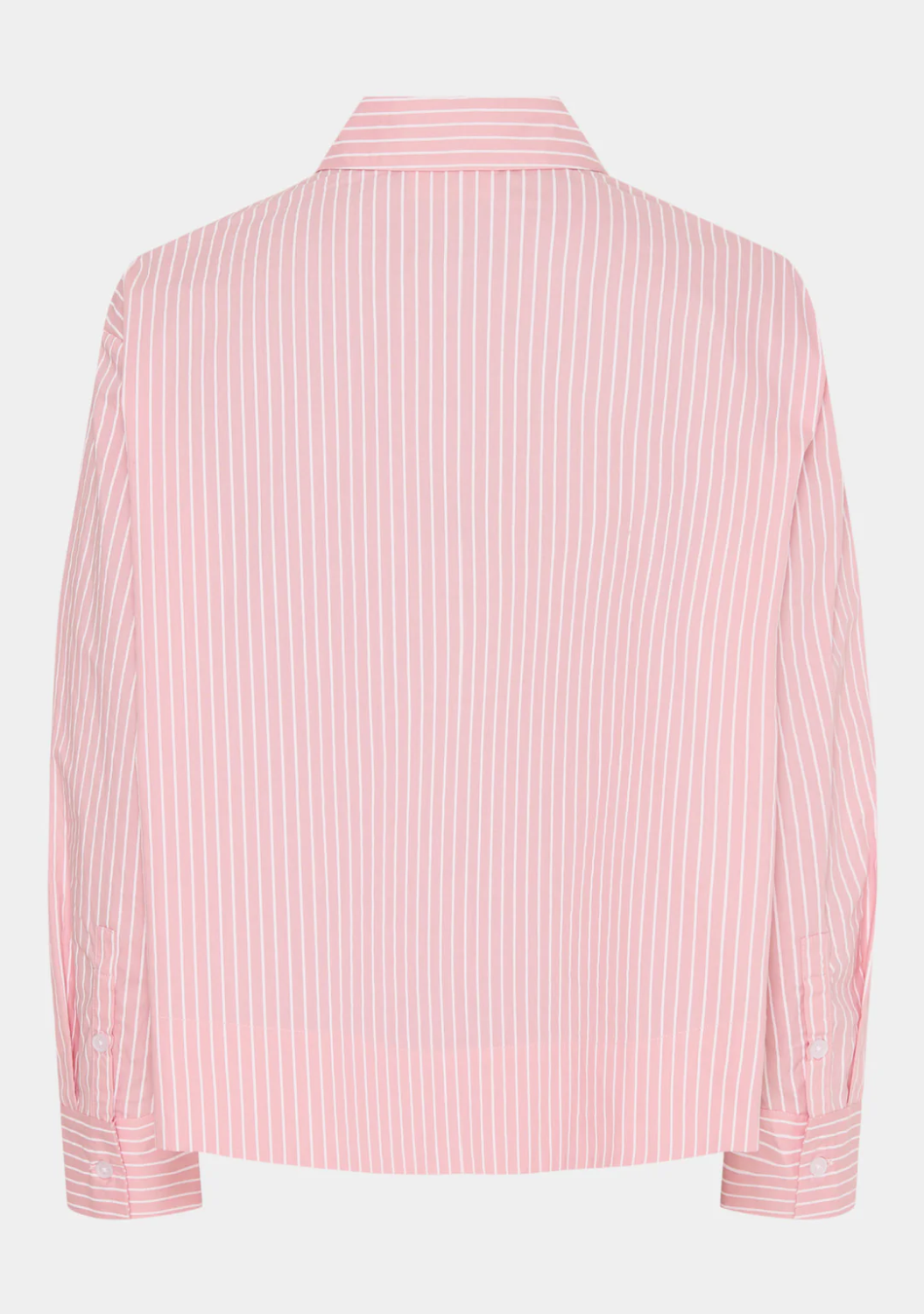 Den er laget i en lett og behagelig bomullskvalitet og designet med klassisk krage og knappelukking. Skjorten har en kortere lengde og en løs passform, noe som gir en smigrende og moderne silhuett.