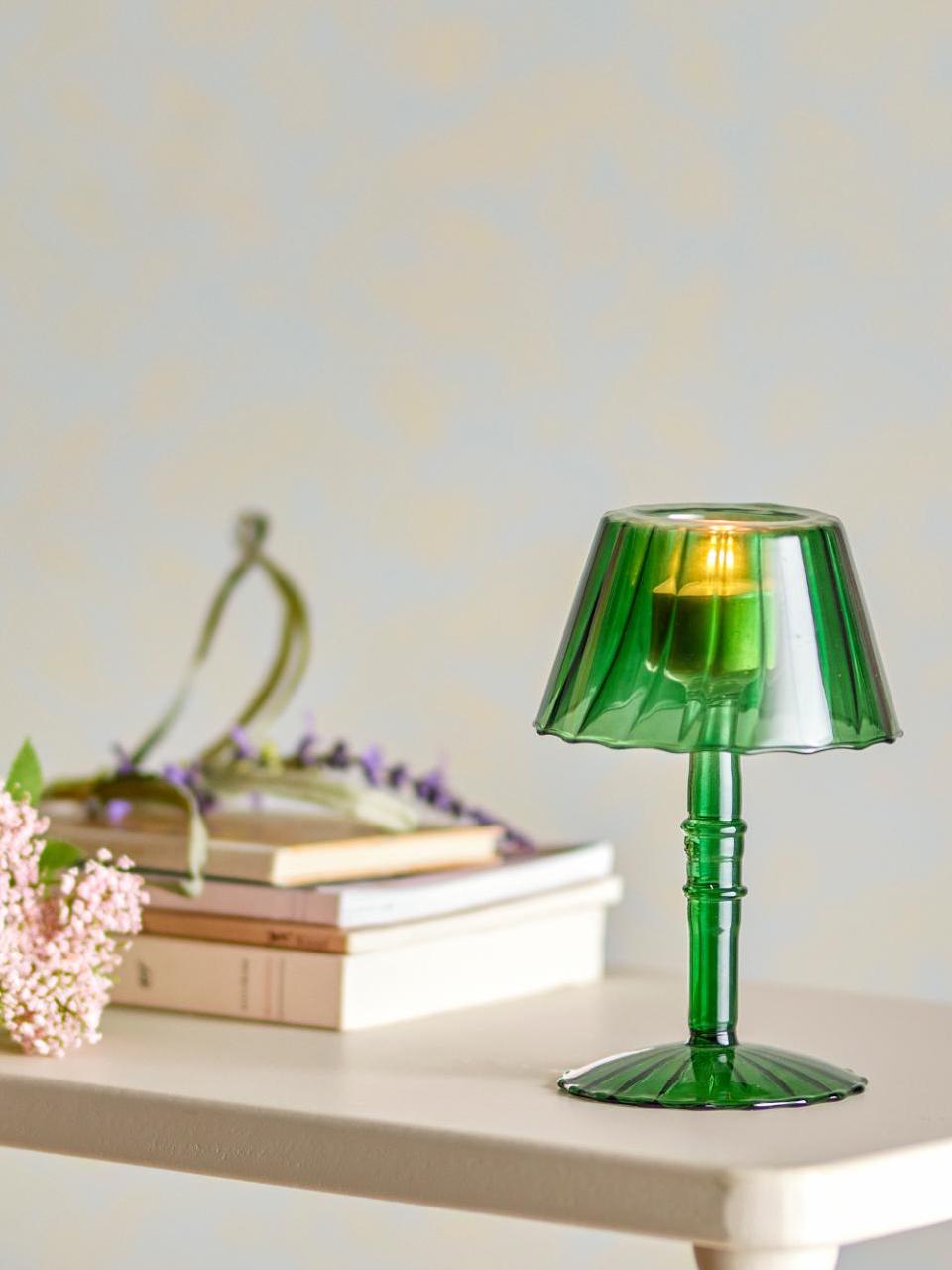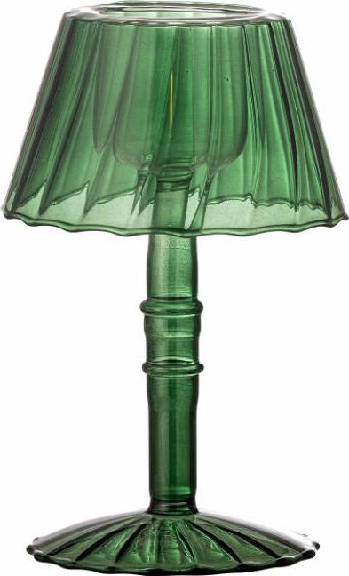 The Cisco Votive by Bloomingville is made of glass with a deep green hue that creates a warm and cozy atmosphere. Designed for tealights, it functions as a small lamp, adding an elegant touch to the decor. The base and shade are adorned with beautiful details that give it a delicate appearance. Place it on the windowsill, dining table, or shelf to add a touch of warmth.