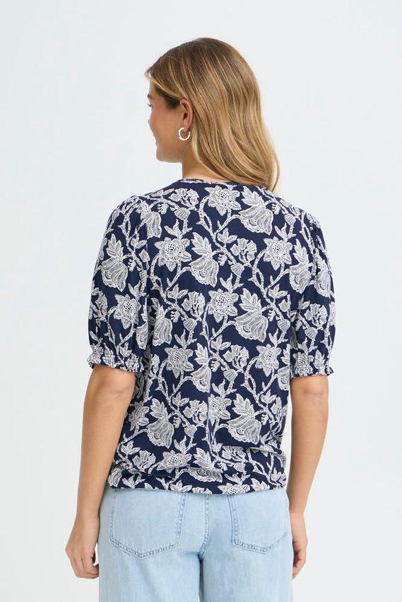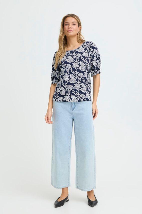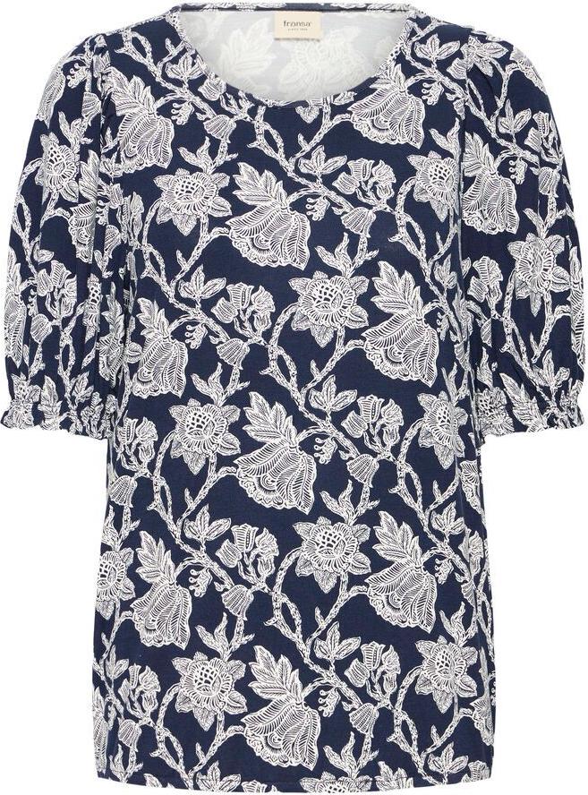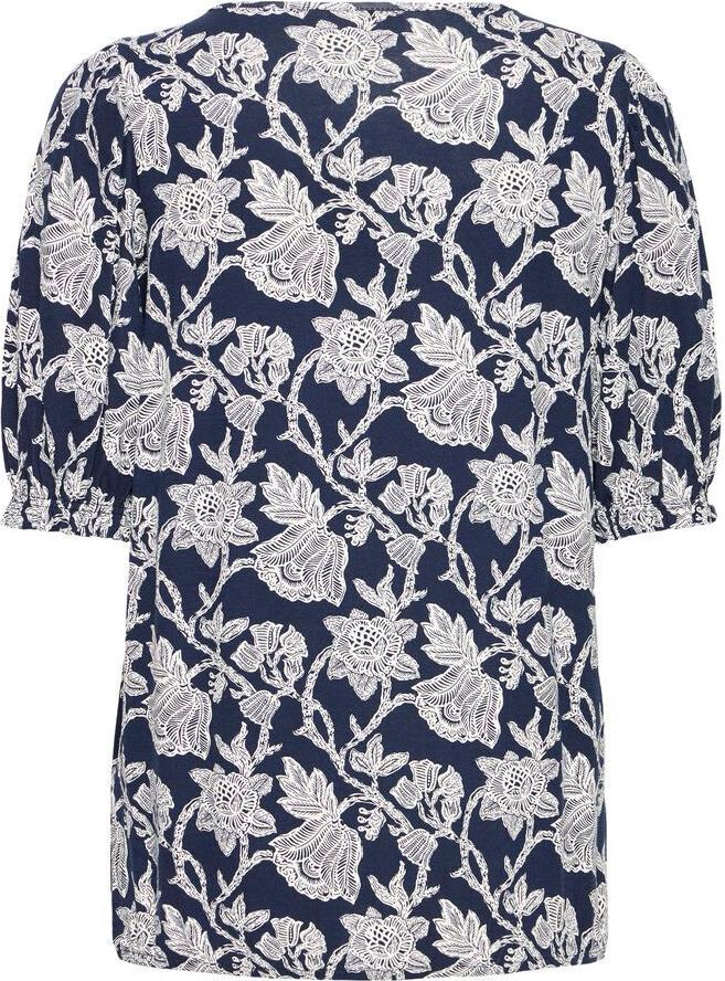 Blomstrete topp med rett passform, rund hals og myk overflate. Voluminøse albuelange ermer gir et friskt og moderne uttrykk.