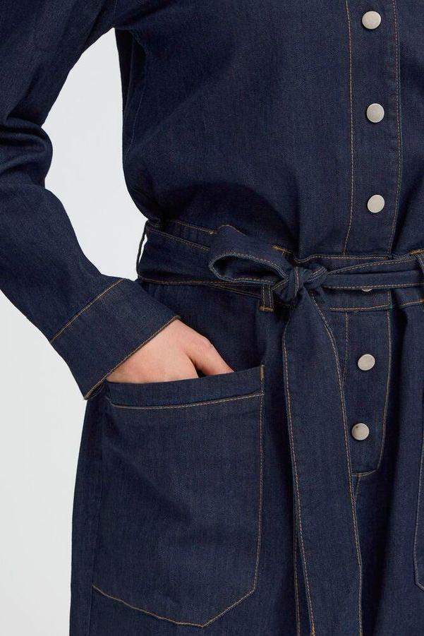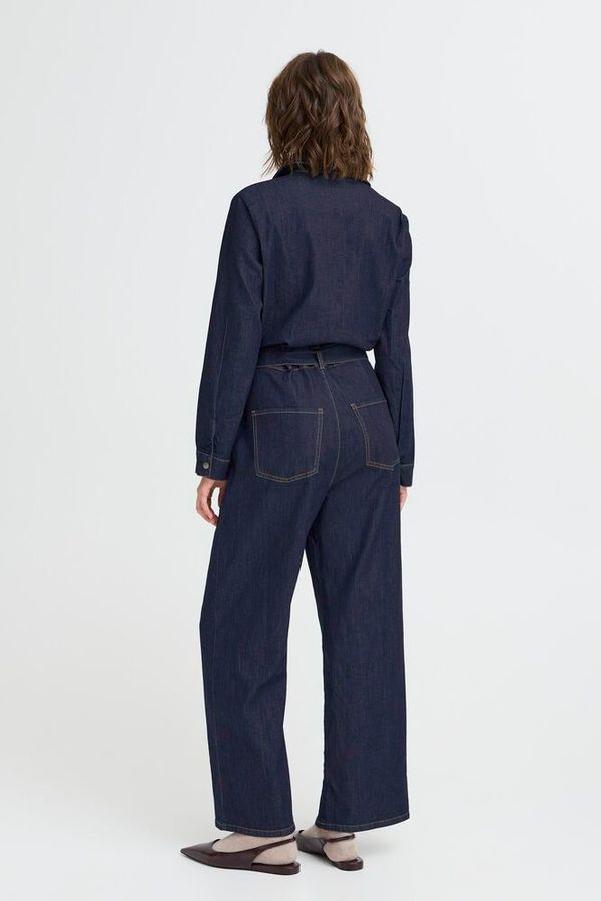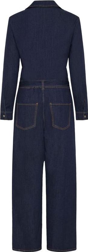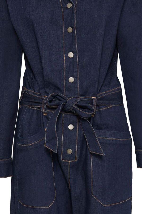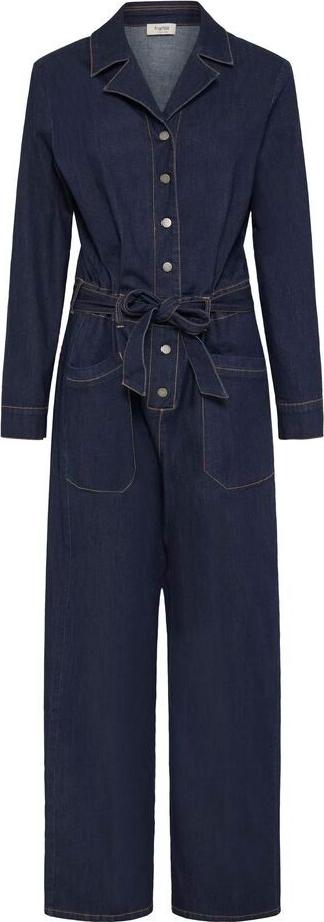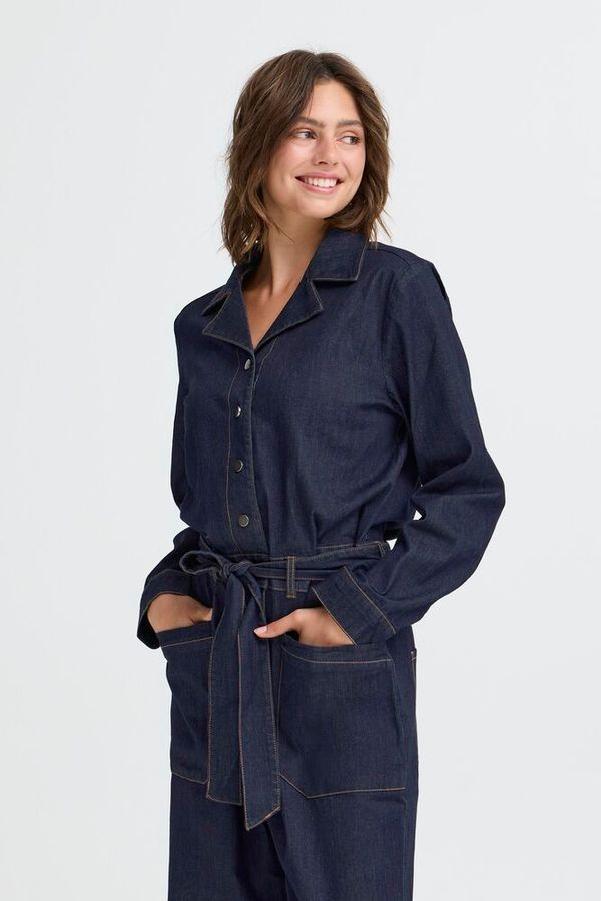 Denim jumpsuit fra Fransa. Lange ermer, skjorte krage og rette ben. Trykk knapper i front, lommer forran og bak og belte i livet.