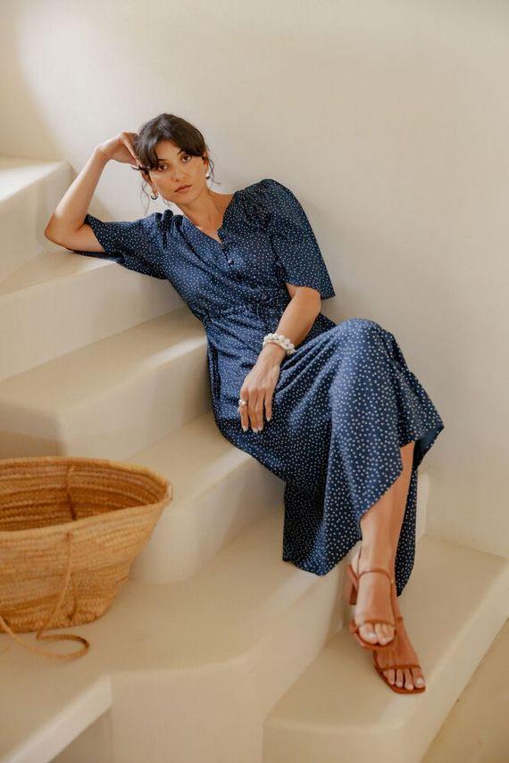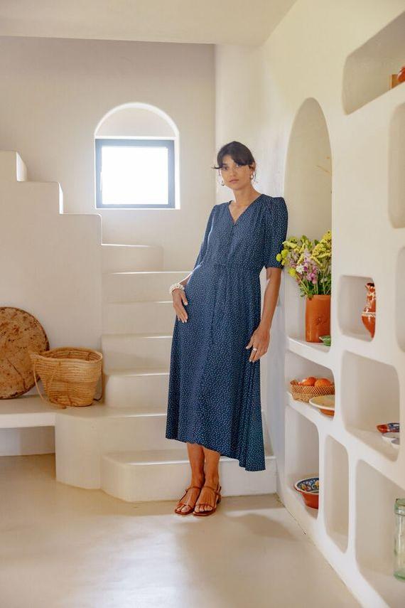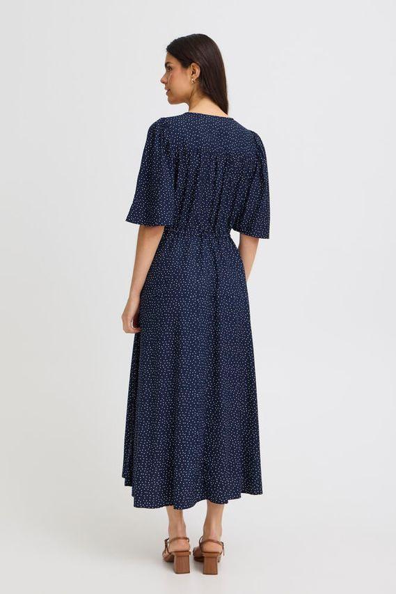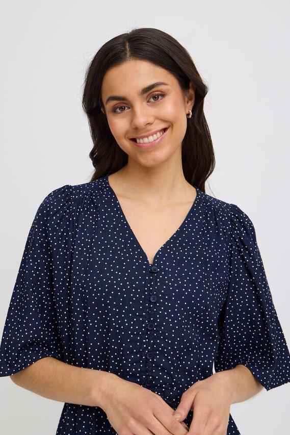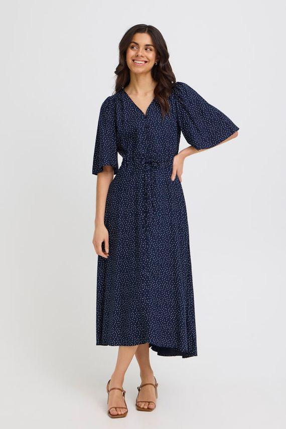 Kjole fra Fransa i 100% viskose. Kjolen har korte, voluminøse ermer. Den har knepping i front, midjesnøring for justerbar passform, og midi-lengde som passer til både hverdags og fest.
