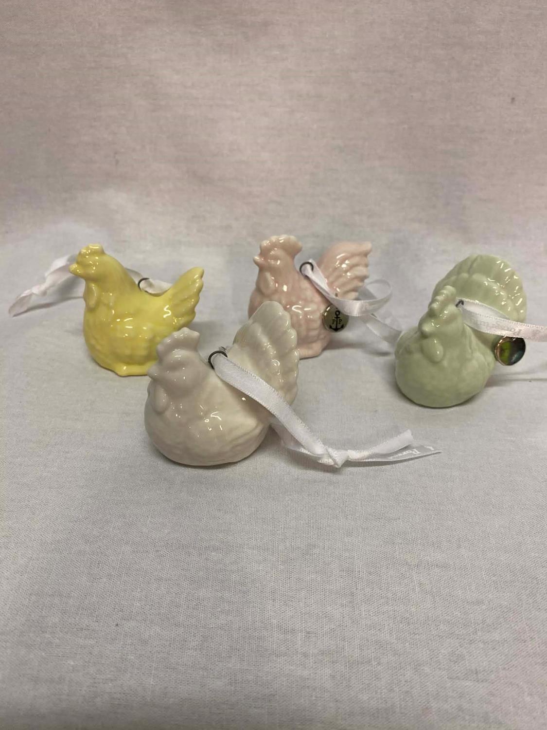 Sett med fire dekorative høner i porselen, designet for å henges på grener, i vindu eller som del av en påskekrans. En leken og klassisk pynt som gir umiddelbar påskestemning.