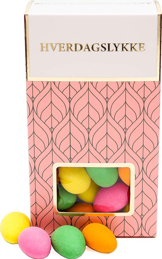 Ingredienser: Sukker, ristede mandler (25%), kakaomasse, kakaosmør, risstivelse, fortykningsmiddel (E414), gelatin, glukosesirup, emulgeringsmiddel (soyalecitin), naturlig vaniljesmak, kokosolje, fargestoff (E101, E120, E141, E160a).