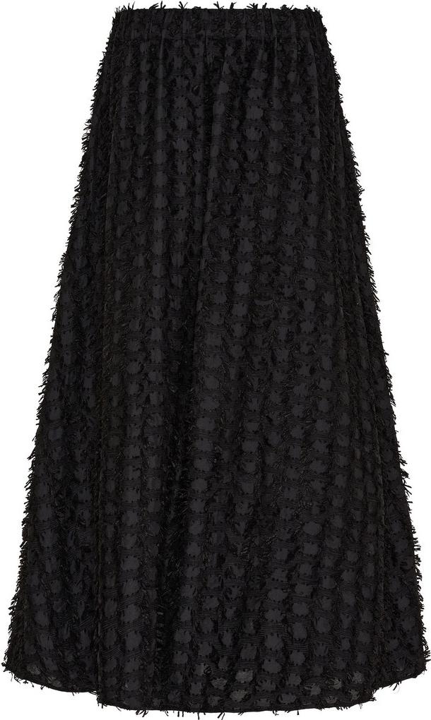 Dette elegante A-linjeformede midi-skjørtet kombinerer klassisk design med unike detaljer. Det er laget av et stoff med dekorativ frynseeffekt, som gir et eksklusivt og levende uttrykk. Skjørtet har en fast linning med beltehemper, slik at du kan legge til din favorittbelte, og det lukkes med knapp og glidelås foran. Foran finner du praktiske lommer med fine legg, som legger til en feminin touch og gjør skjørtet både vakkert og funksjonelt. Perfekt å style med en lett skjorte til daglig bruk eller en strikk til kjøligere dager.