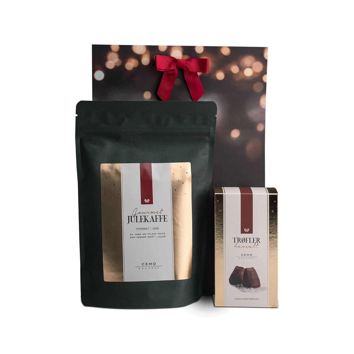 Gi en liten oppmerksomhet til noen du er glad i. Filtermalt, fyldig og god julekaffe og juletrøfler med havsalt er alltid en hyggelig gave å få. Juletrøflene er myke og kremet, med et hint av havsalt og rullet i kakaopulver. Perfekt som en vertinnegave eller kanskje til kollega som fortjener en liten gave til jul.