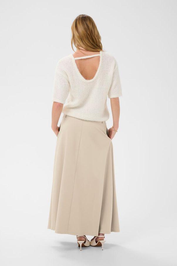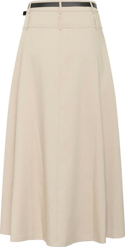 Lang A-linjeformet skjørt med mykt fall, subtil frontsplitt, strukturert linning, beltehemper og smalt belte med spenne.